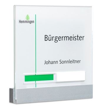 Das Türschild mit der Anzeige Frei / Besetzt der Serie Kristallino-lang zur Selbstbeschriftung zeichnet sich durch seine elegante einseitige Halterung aus.