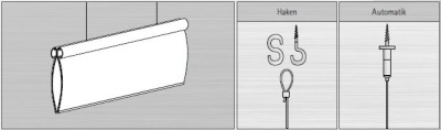 Zur Deckenabhängung wird das Schild mit 2x 1,5 m Stahlseil und 2x Pressösen geliefert. Die Befestigung kann entweder mit herkömmlichen Haken oder mit einer Deckenautomatik erfolgen. Pro Schild werden 2 Automatiken benötigt. Die Automatik erlaubt ein leichtes Nachjustieren der Seillängen. So können Unebenheiten problemlos und schnell ausgeglichen werden.