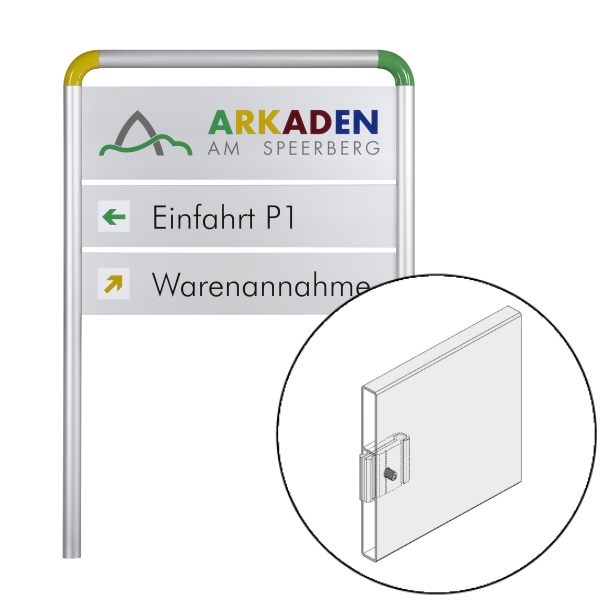 Die umfassende Kollektion an Pfosten und Standardpaneelen erlaubt eine individuelle Gestaltung von Wegweisern und Aussenaufstellern in vielen Bereichen.