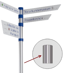 Bestehend aus einem Pfosten und einem oder mehreren Beschriftungspaneelen zeigt das City-Guide-Sternenschild immer den Weg in die richtige Richtung. Und dies nicht nur in Städten, sondern auch in vielen anderen Freigeländen, wie Parks, Tierparks, Messe-Freiflächen und Schwimmbäder.